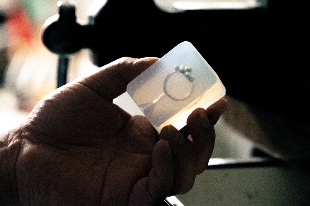 今回の指輪のデザインは、沢山の石の配置が重要な要素。ここで試行錯誤するために3D CADで制作してきました。完成したデータは3Dプリンターで出力した状態です。