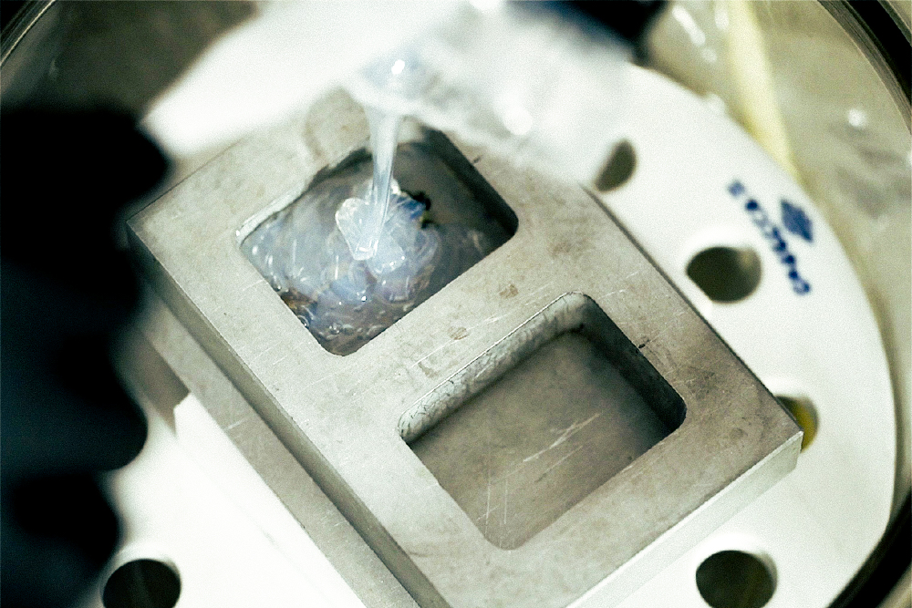 液体シリコン主剤単体で、硬化剤を混ぜた後、型に流し込んだ後、と三段階に分けて脱泡します。修正するのが難しい箇所に気泡が付着した状態でシリコンが固まってしまうと、一発アウト。