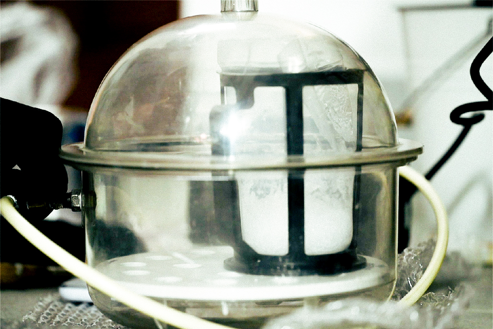 真空ポンプを使って減圧して、液中の気泡を抜きます。