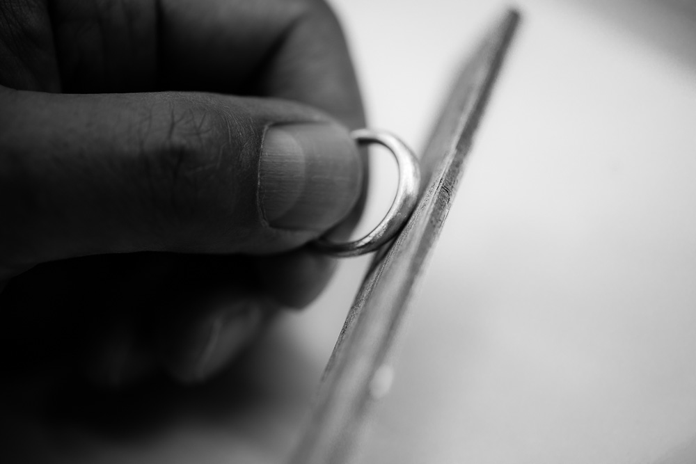 ここからいよいよ外形を整えていきます。サンプルとして制作したシルバー製の指輪のラインを再現するにはがっつり削る必要がありながらも、行き過ぎは許されないというスリルのある作業。一部分の流れが全体の流れに繋がるので、ラインが崩れればすぐに破綻してしまいます。